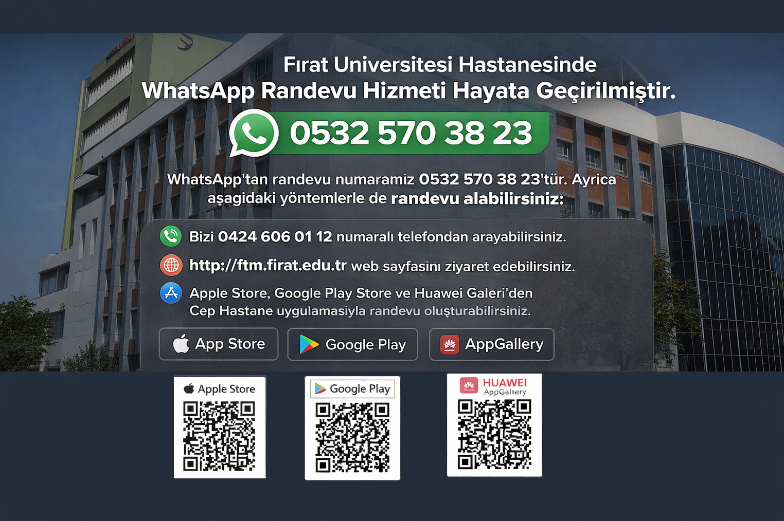 Fırat Üniversitesi Hastanesi, vatandaşların sağlık hizmetlerine daha hızlı ve kolay erişebilmesi amacıyla randevu sistemlerini geliştirmeye devam ediyor. Bu kapsamda hastanemizde WhatsApp üzerinden randevu alma hizmeti devreye alınmıştır.